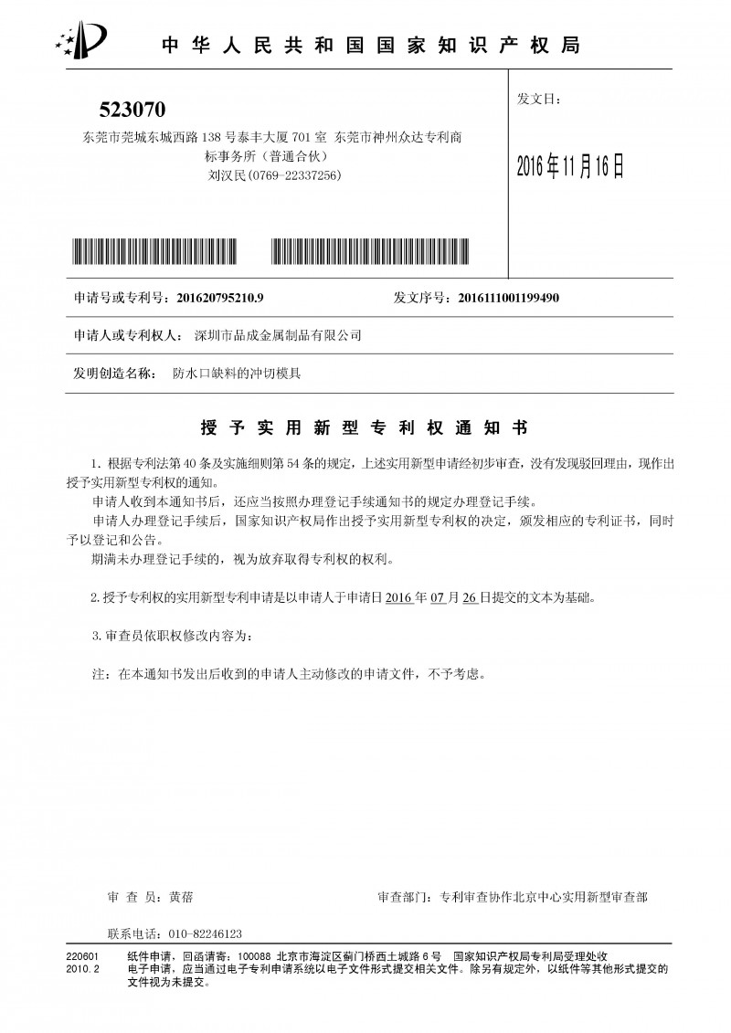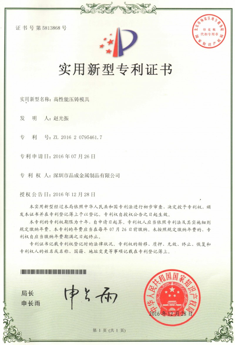 導語: 2016年11月,我司自主研發的兩項實用新型專利——“防水口缺料的沖切模具”、“高性能壓鑄模具”,被國家知識產權局正式授權。2017年1月,正式收到此兩項實用新型專利證書。