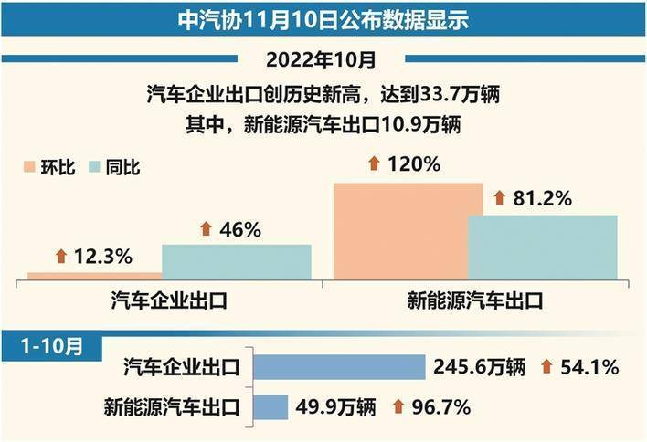 10月,汽車企業出口創歷史新高,達到33.7萬輛,環比增長12.3%,同比增長46%。1-10月,汽車企業出口245.6萬輛,同比增長54.1%。分車型看,乘用車出口197.5萬輛,同比增長57.1%;商用車出口48萬輛,同比增長43%;新能源汽車出口49.9萬輛,同比增長96.7%。