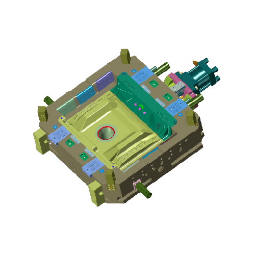 前模暗抽行位且角度較大、產品沙孔要求較嚴格,因前模孔位的投影面積較大,如何保證在壓鑄機器增壓時行位不退位是此項目的技術難點。